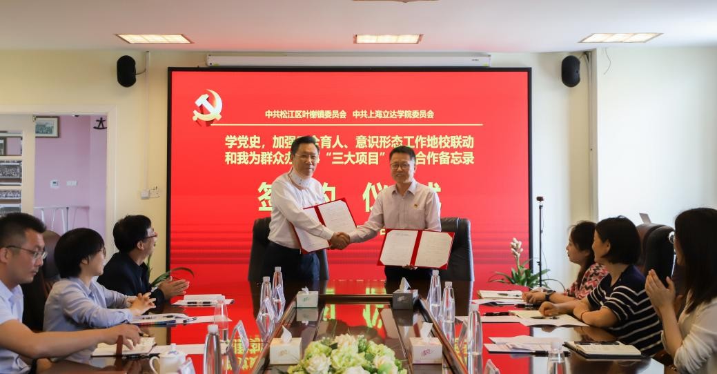 为落实教卫工作党委、松江区创建本市“三全育人”示范城区和建立区校意识形态工作联动机制的要求,进一步巩固上海立达学院党委和叶榭镇党委地校共建,推进区域化党建工作,助推镇“十四五”规划全面落实和学校党的工作引领各项事业高质量发展,5月19日上午,校党委与叶榭镇党委“学党史,加强三全育人、意识形态工作地校联动和我为群众办实事‘三大项目’地校共建实施合作协议签约仪式,在上海立达学院行政楼第四会议室隆重举行。叶榭镇党委副书记夏志强、上海立达学院党委书记张天启代表地校双方在协议上签字。